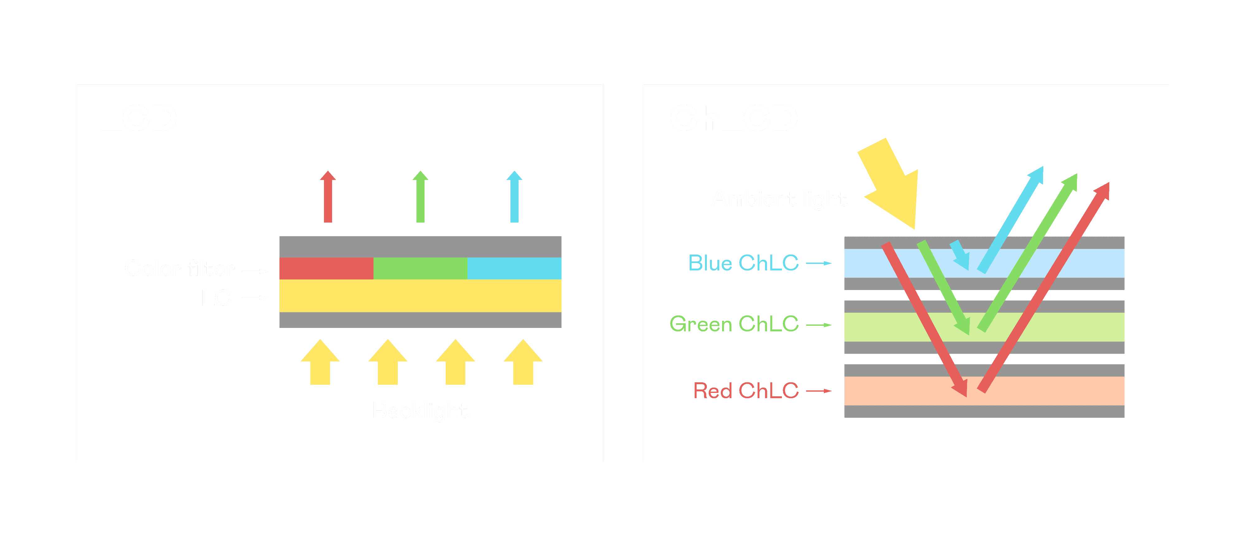 ChLCD 胆固醇液晶就如同纸张一样,,透过反射环境光来显示影像,,,因此长时间观看不易造成人眼视觉疲劳,,,可达到护眼效果。。当处于户外阳光下使用,,,,LCD 影像容易失真而不易观看,,但胆固醇液晶仍可维持较佳的影像品质。。