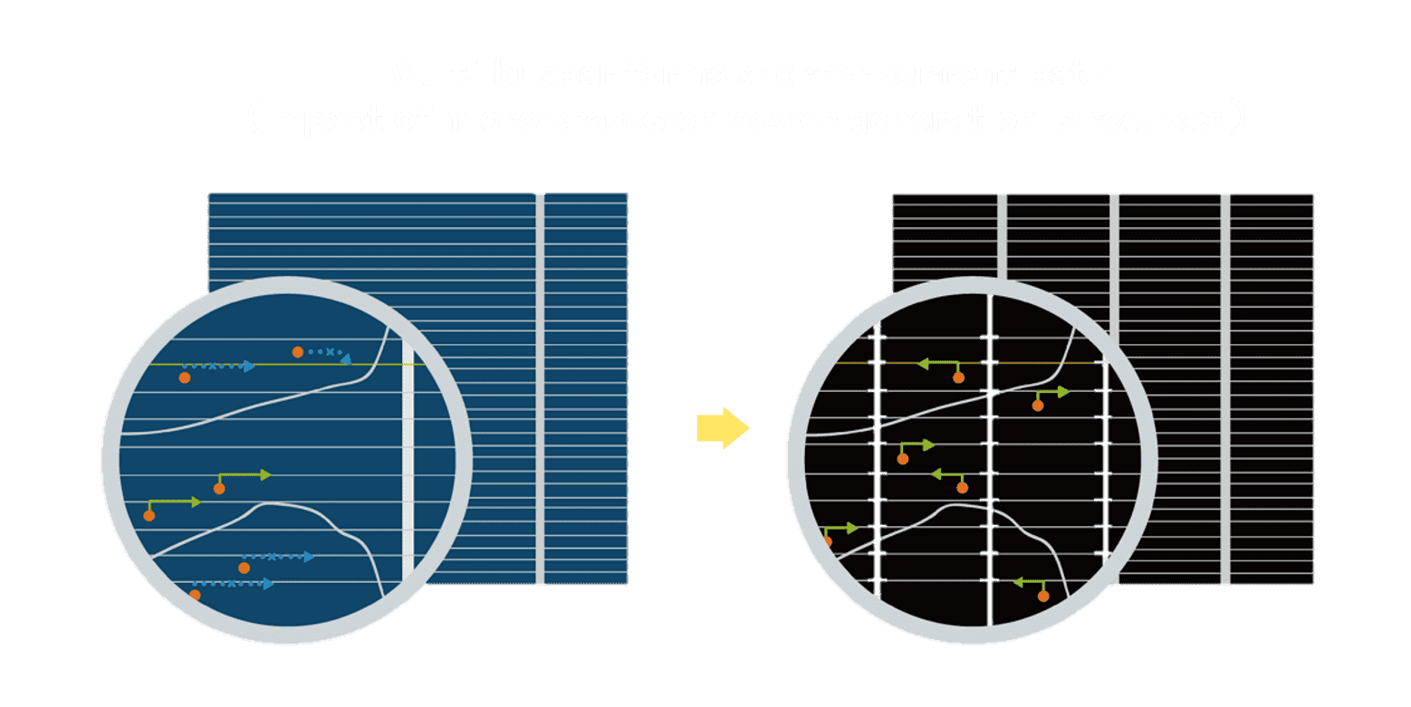 • 电池使用多条铜导线 (Copper wire) 于电池片上形成较短的电流路径,,,提高电流收集效率,,,,采用圆形设计的铜导线较传统扁平式的铜焊带 (Ribbon),,,,可增加入射至电池的光线量。。。
