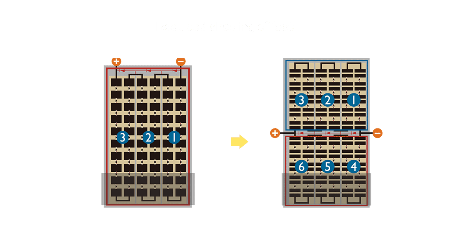• 结合半切电池,,降低遮阴影响、、、、提升模组抗隐裂能力、、并减少电阻损耗,,,进一步提升模组发电效能。。。